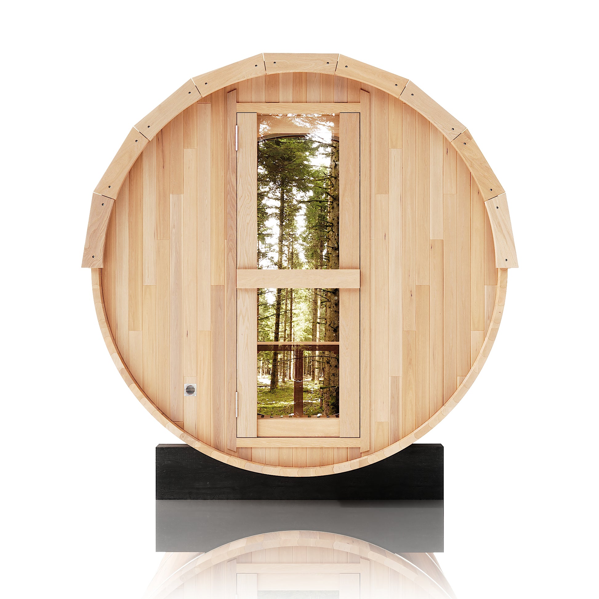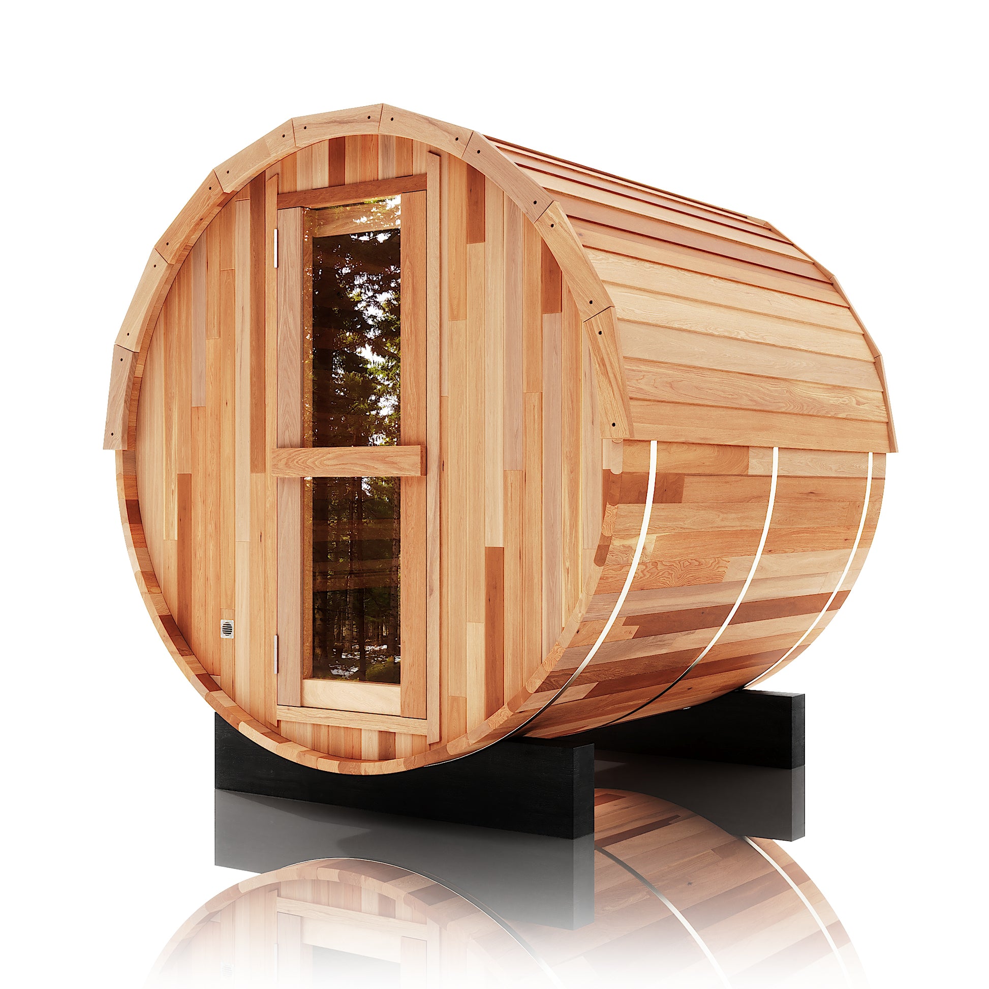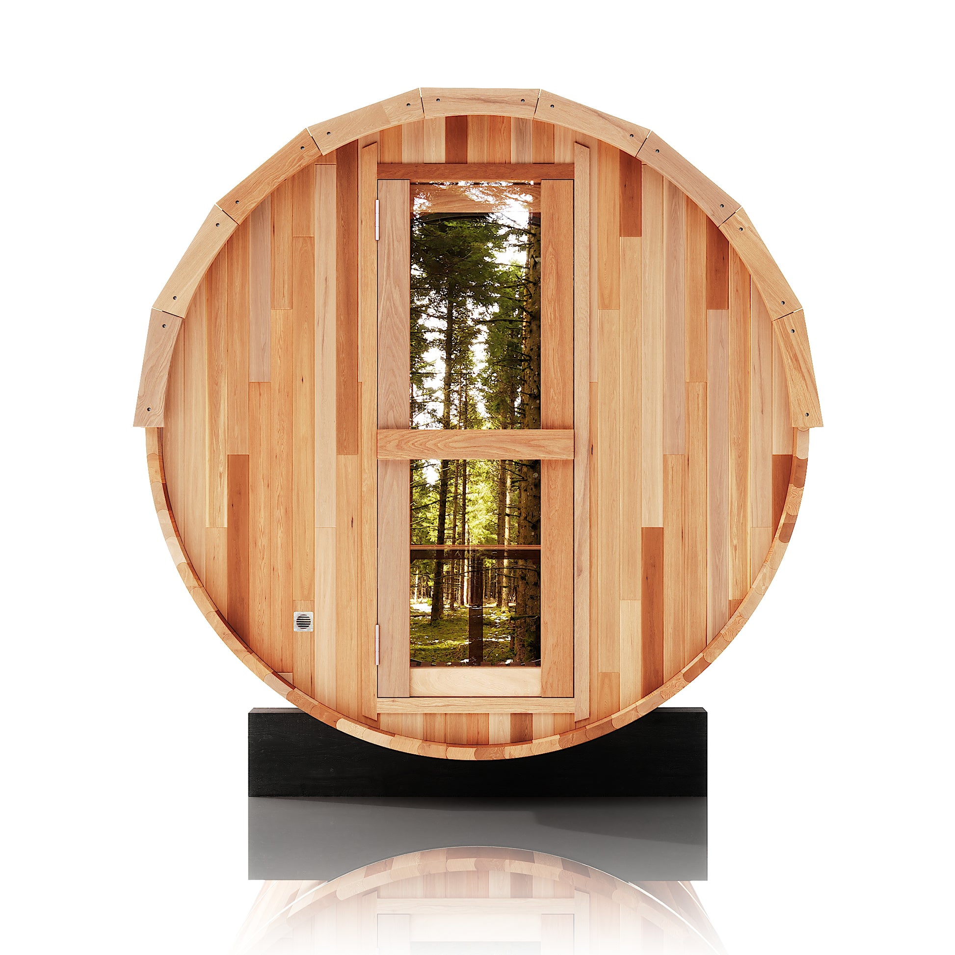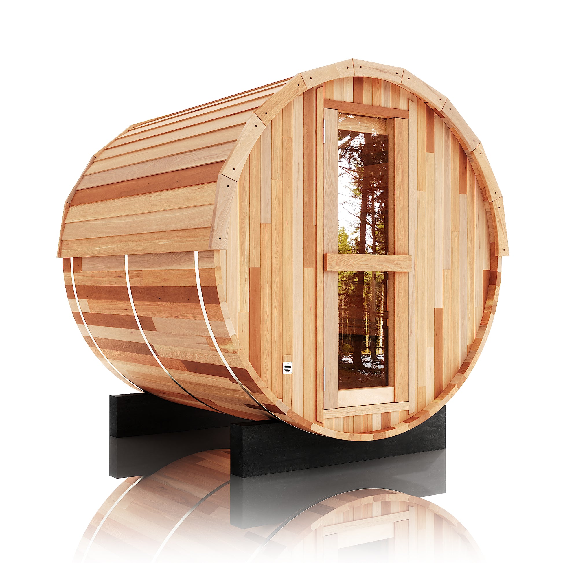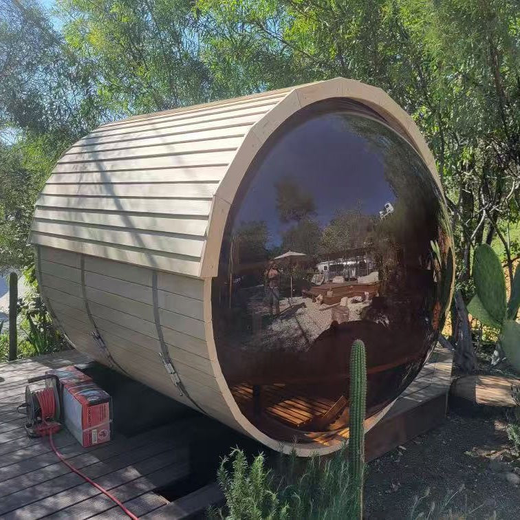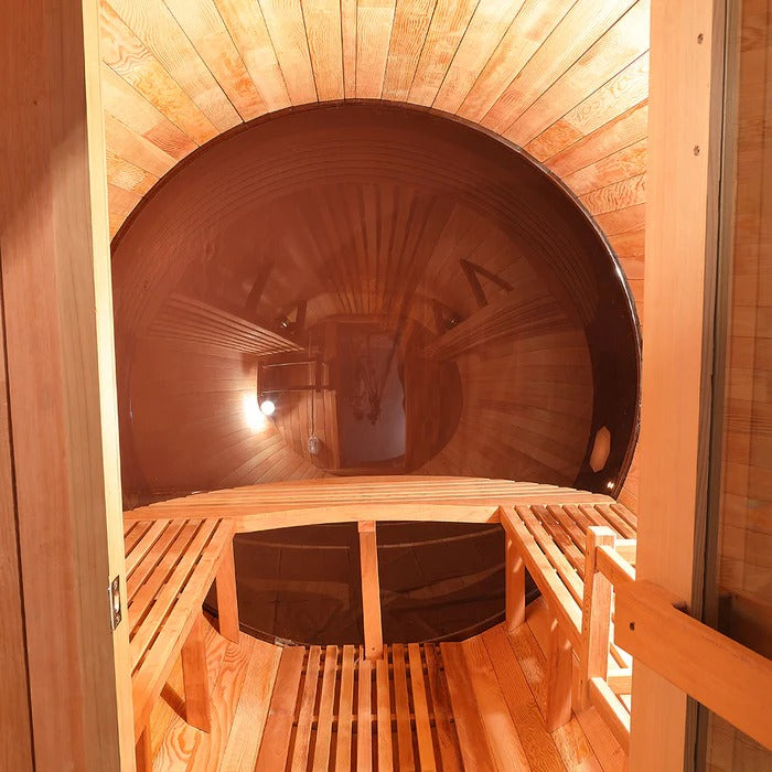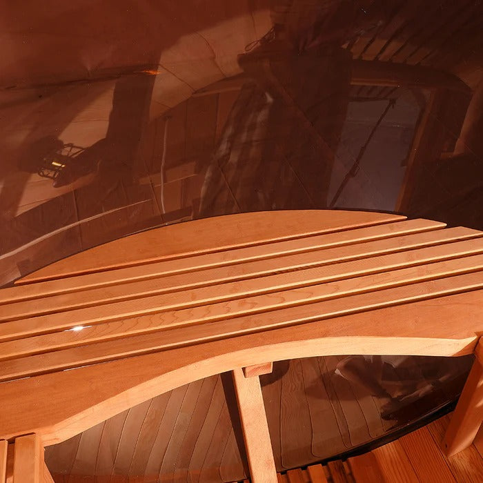 The Trailblazer sauna is designed for 4–6 people and is available in premium Hemlock or Red Cedar wood, offering natural durability, excellent insulation, and resistance to warping, with Red Cedar adding rich aroma and enhanced moisture protection; it is powered by a Harvia SW60 electric heater delivering 6.0 kW of heat on 220V / 240V with a 30A current, and provides a temperature range of 0–195°F for consistent sauna sessions. Each unit includes a complete accessory set with a wooden bucket and spoon, anti-crack volcanic stones for steam generation, a sandglass timer, a thermo-hygrometer, and explosion-proof lighting, while construction highlights include a waterproof asphalt-tiled roof with sealed joints to prevent leaks, a heat-resistant wooden door handle, a breathable vent hole for fresh airflow, high-temperature explosion-proof lighting, and an 18-inch-wide bench designed for comfortable reclining or lying down.