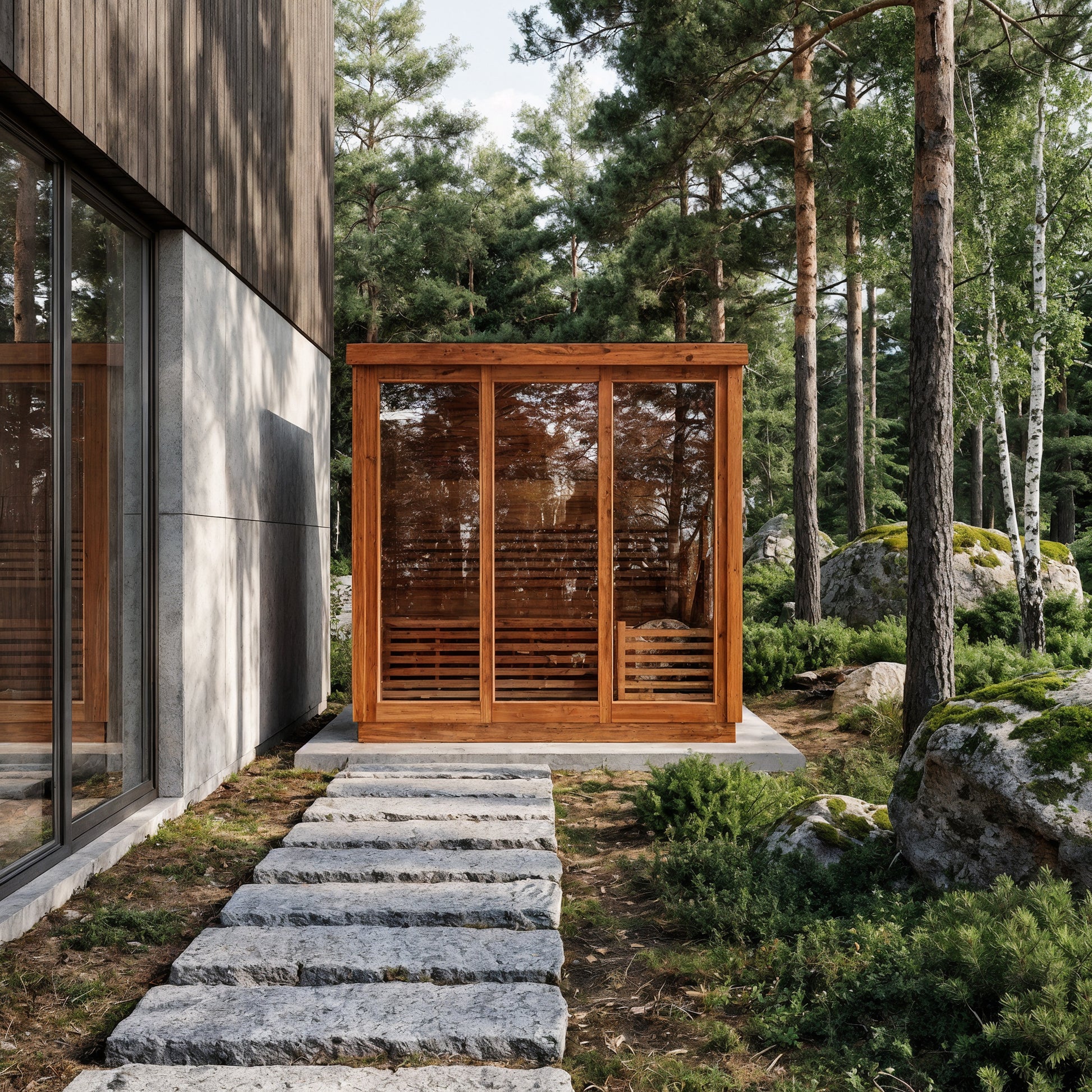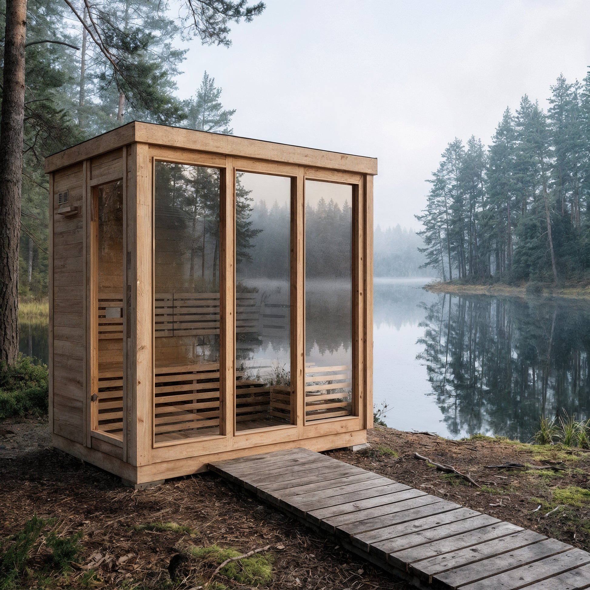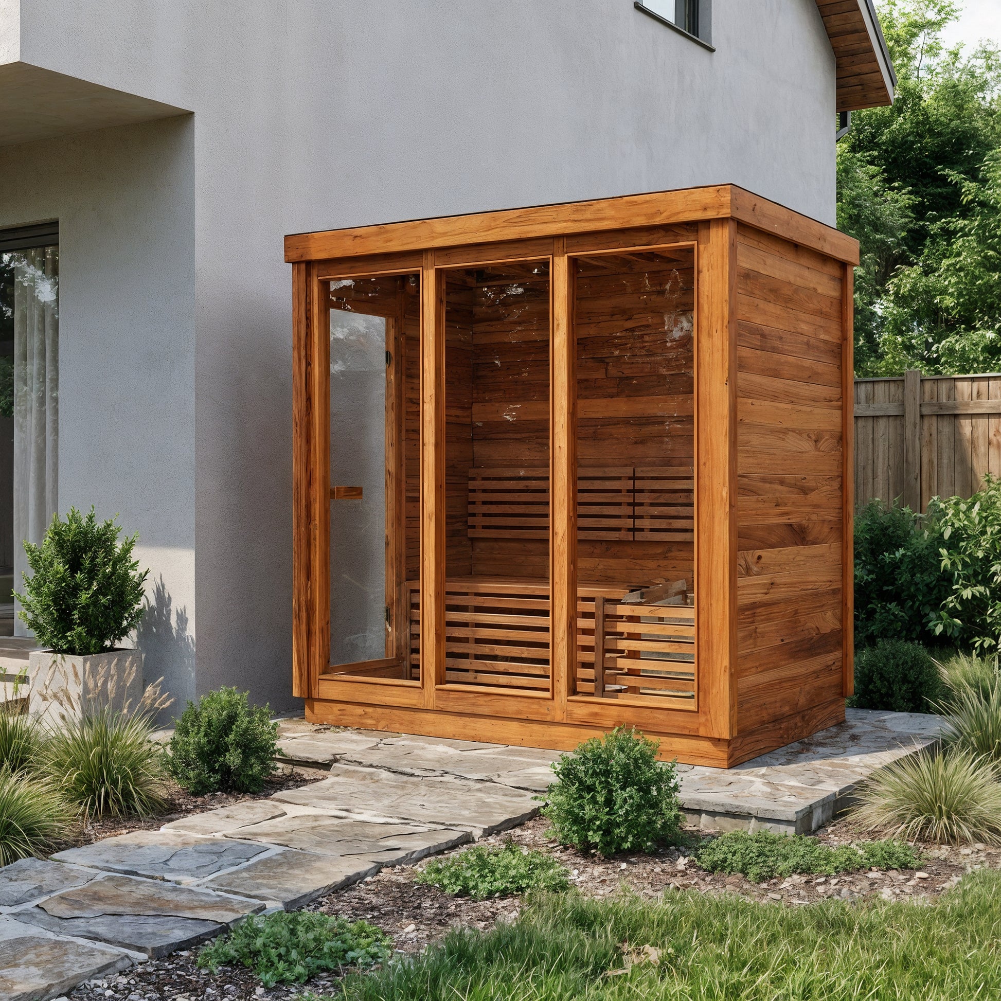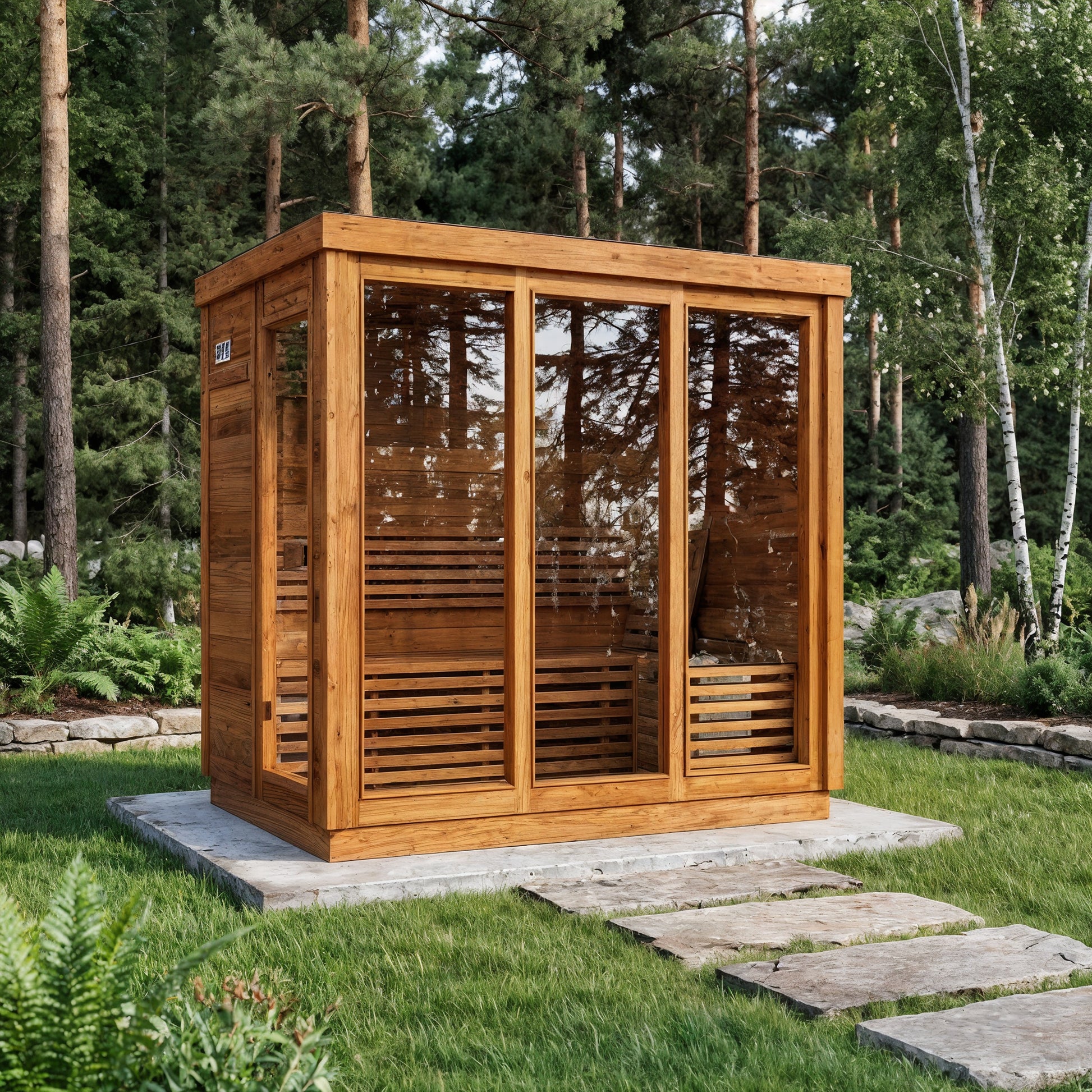 Modern Box Design: Sleek, contemporary sauna featuring three large front glass panels and a side-entry door for easy access and an open, modern feel.