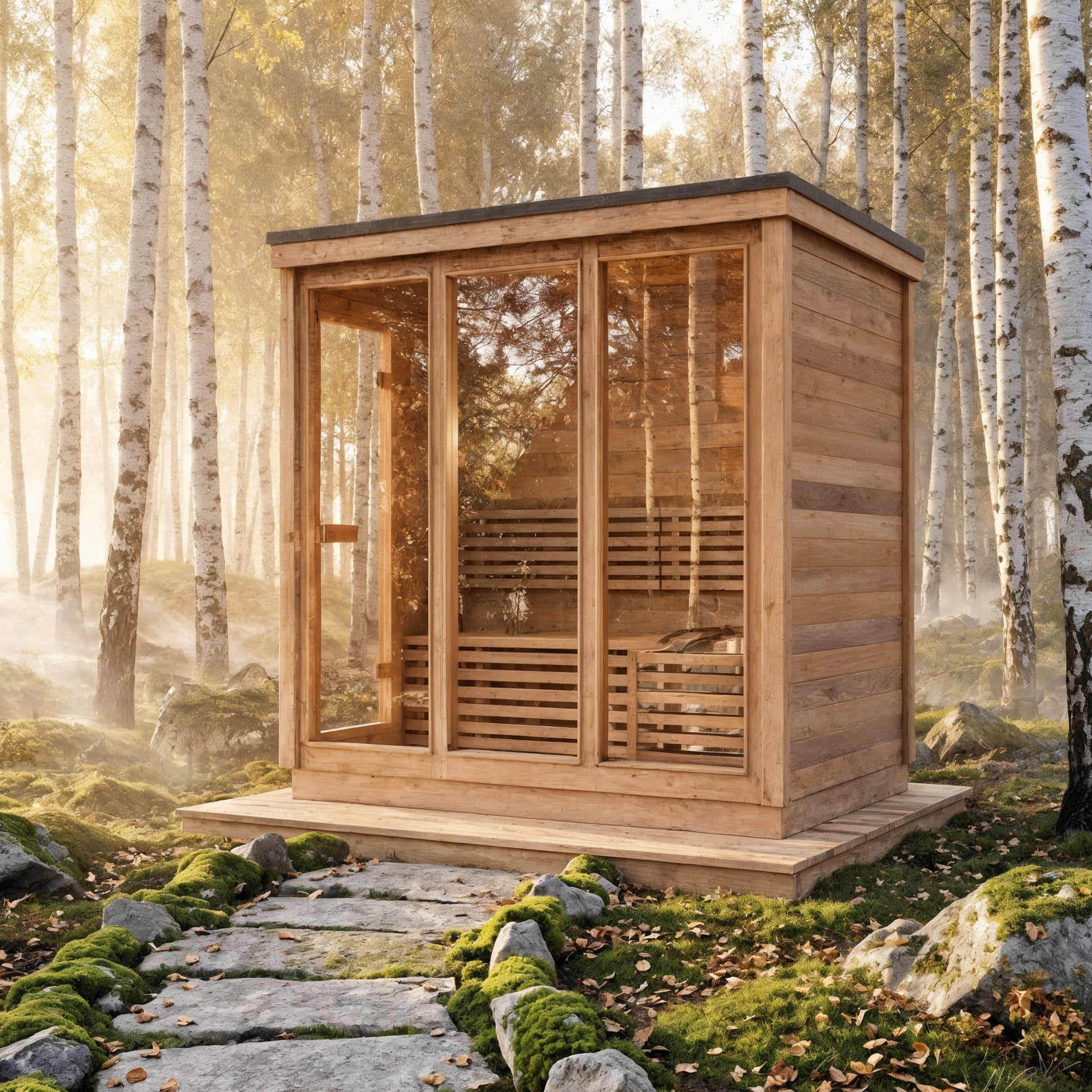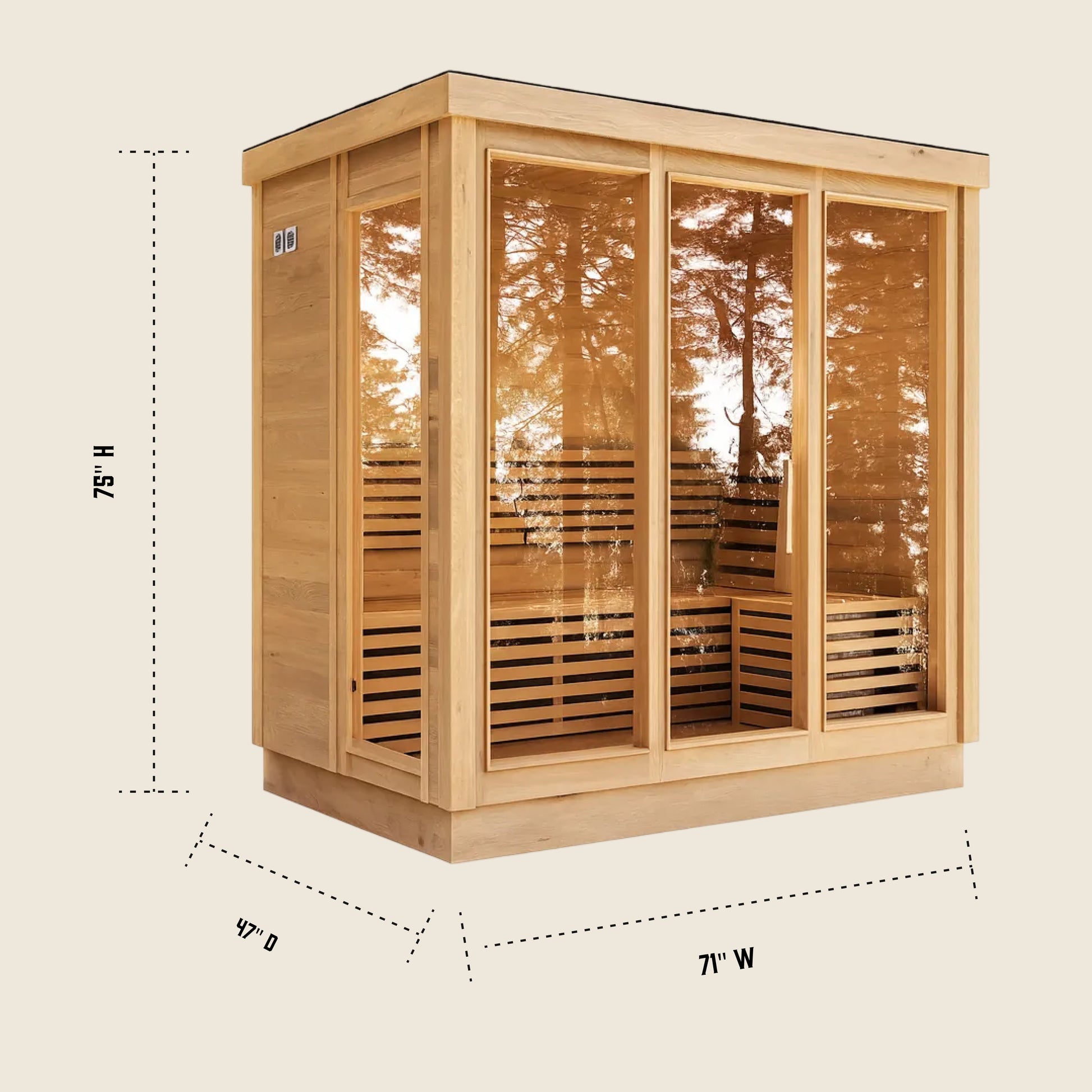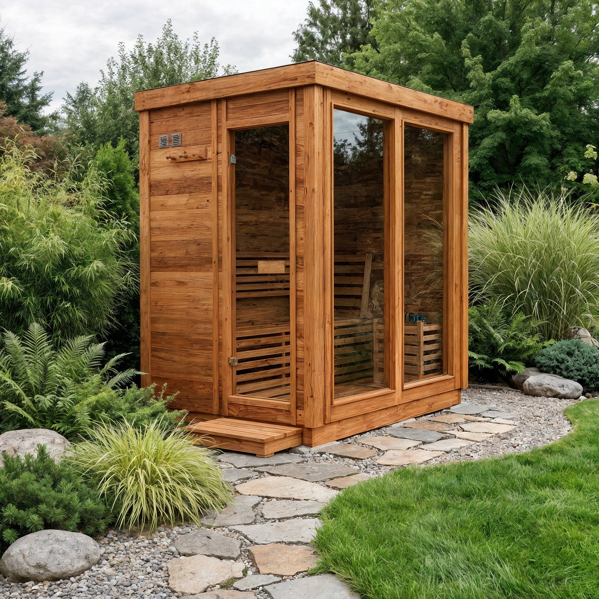 Modern Box Design: Sleek, contemporary sauna featuring three large front glass panels and a side-entry door for easy access and an open, modern feel.