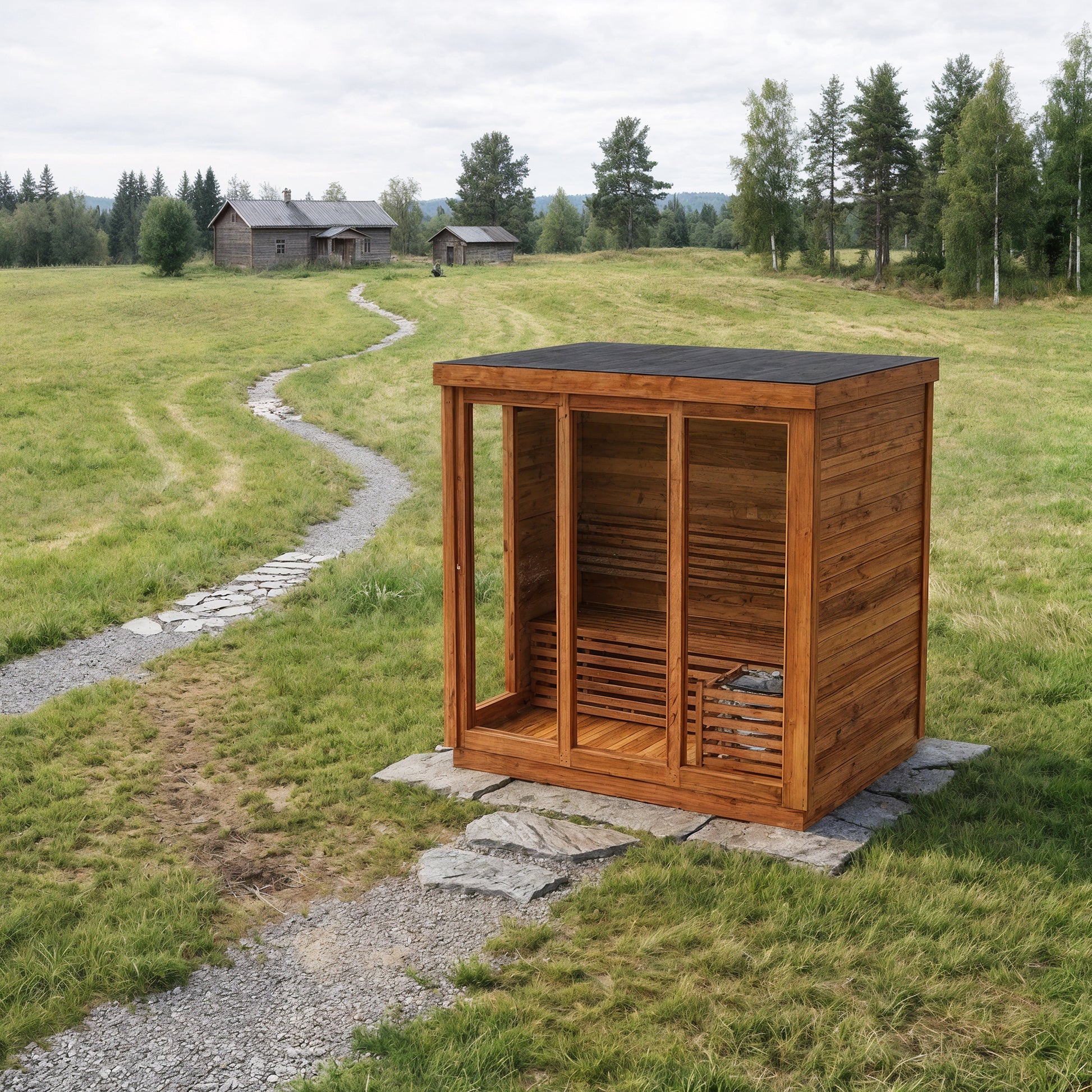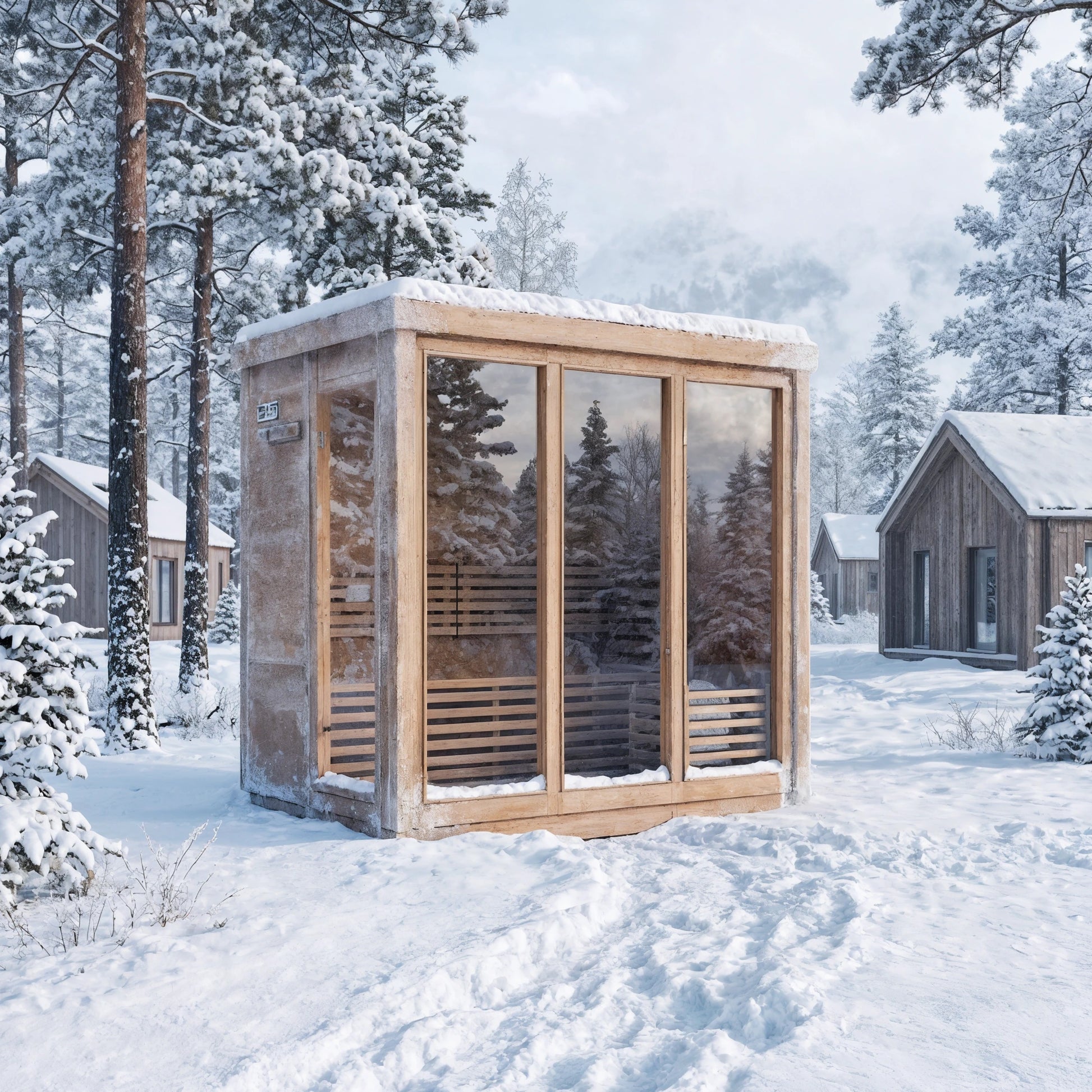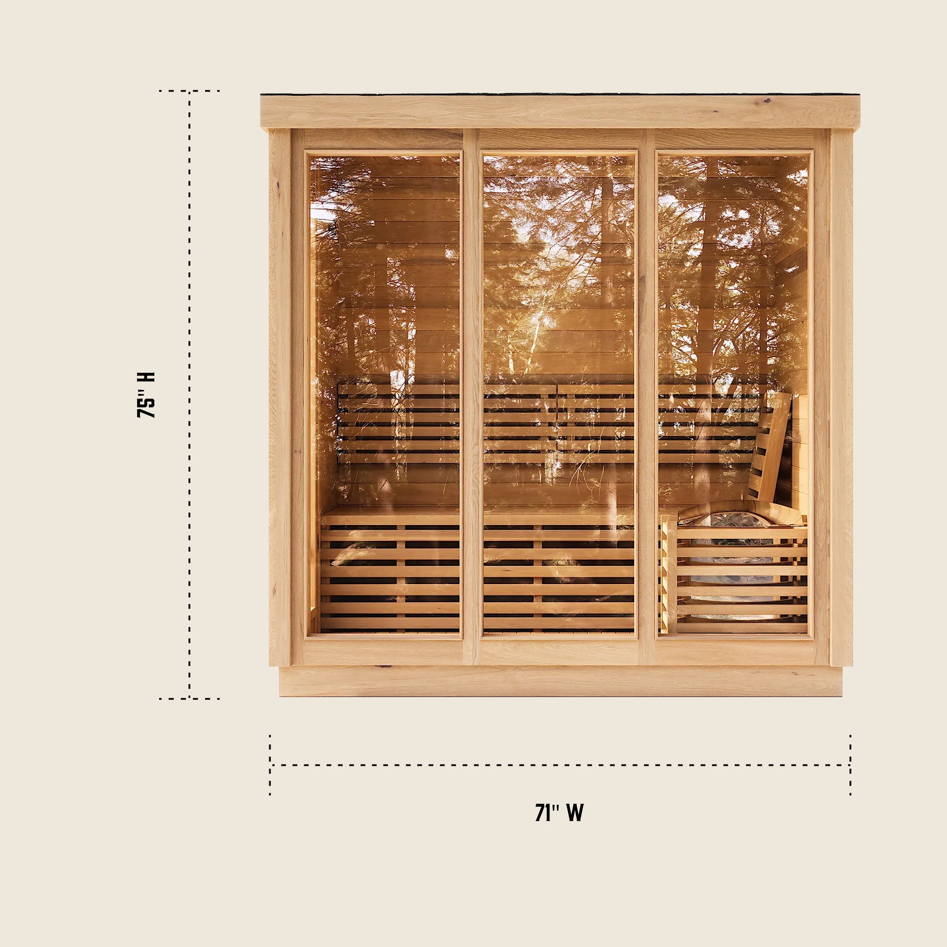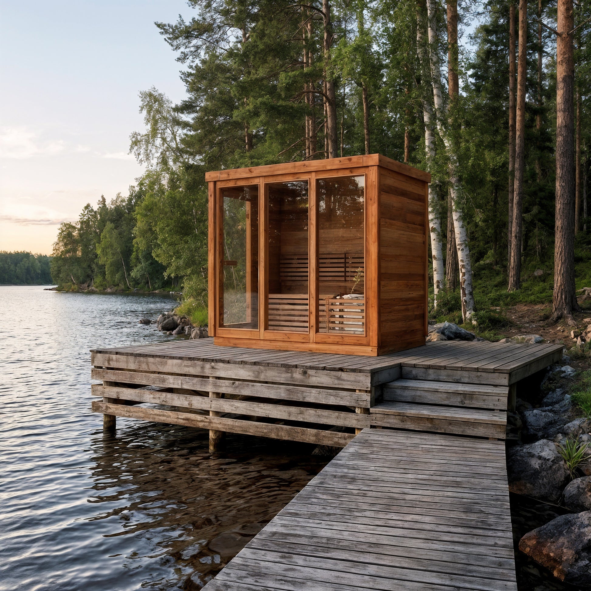 Modern Box Design: Sleek, contemporary sauna featuring three large front glass panels and a side-entry door for easy access and an open, modern feel.